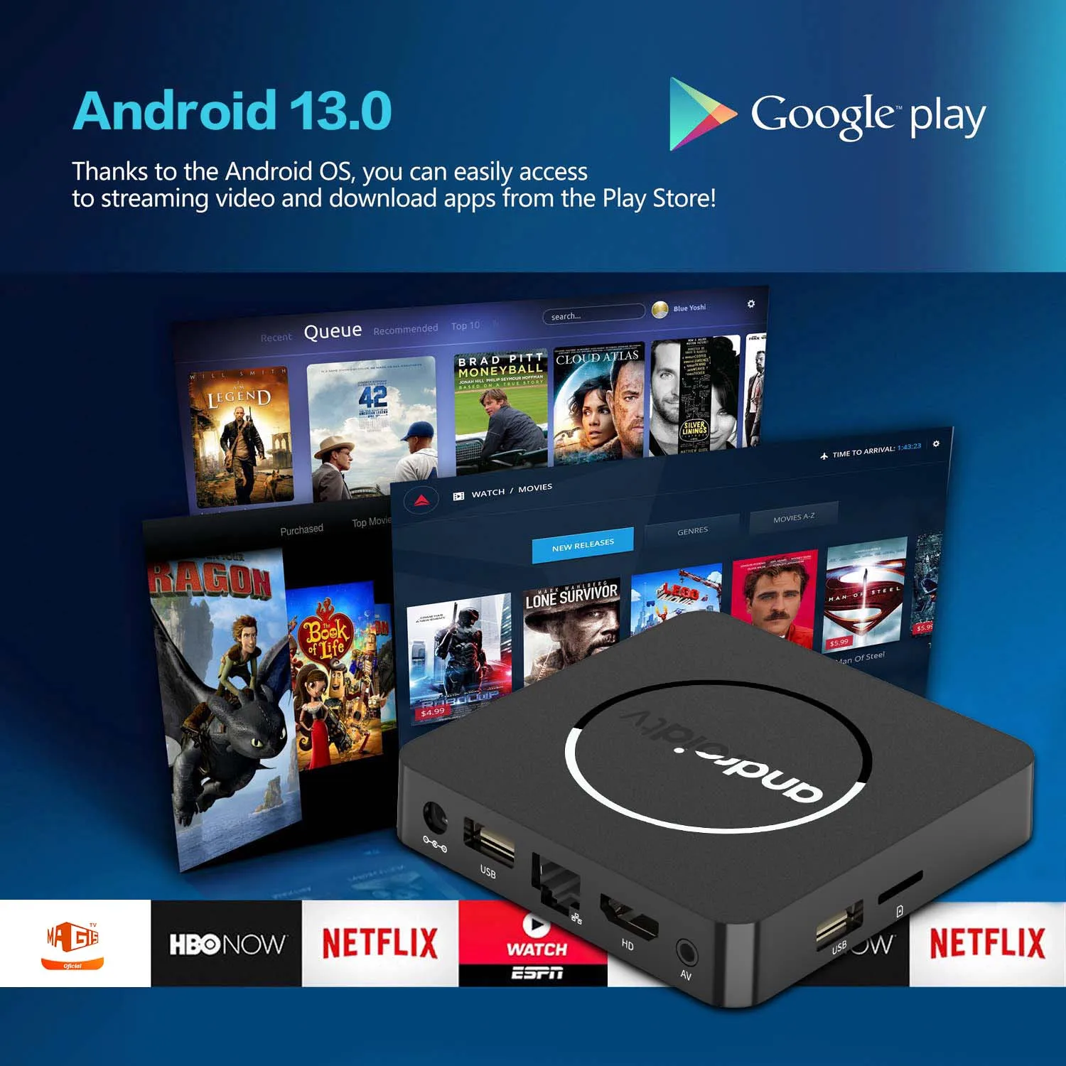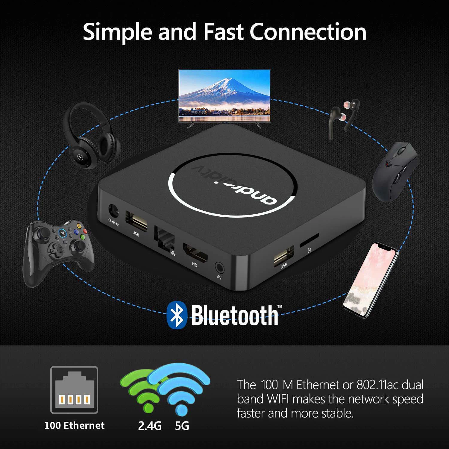 Powered by Android TV 13.0, it supports a wide range of apps and games. Dual-band WiFi 2.4G/5G keeps your connection stable, and Bluetooth 5.2 lets you connect devices like keyboards, controllers, and speakers.
