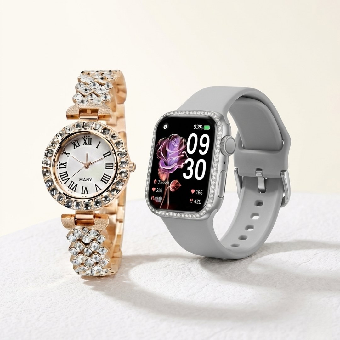 The smartwatch delivers practical daily tech with an HD full-touch display, Bluetooth calling, and real-time message or app notifications. It also covers essential health and fitness tracking, including heart rate, SpO₂, steps, and more, so you can stay aware of your activity and wellbeing. The analog bracelet piece adds high-end style with diamond-style detailing, making this combo ideal for formal wear or gifting. The set is positioned as a strong value choice, pairing fashion with solid functionality.